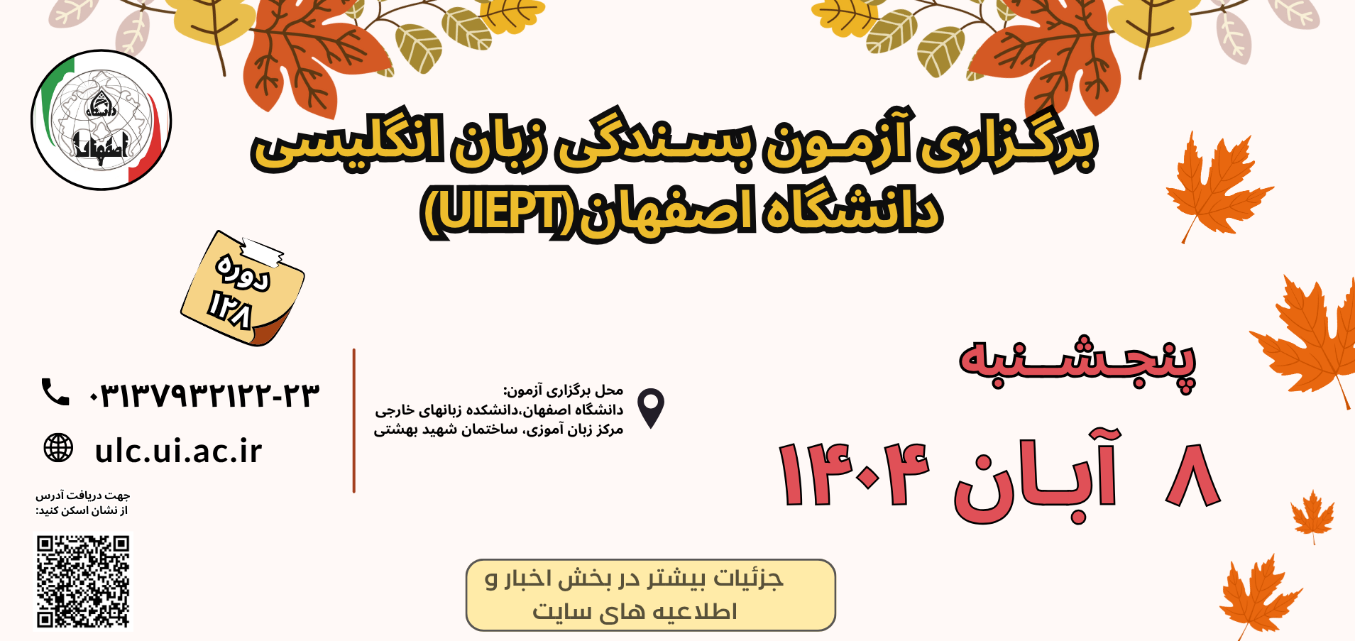 برگزاری آزمون بسندگی زبان انگلیسی ویژه دانشجویان دکتری(UIEPT) 8 آبان 1404